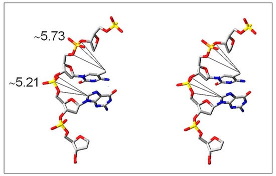 Stereo view of the major groove of DNA where m5C and guanosine (C-8) are located and are freely available for the reaction with •OH. It is indicated by distances (Å) of the reactive sites (-CH3 of m5C and C-8 of G) from a phosphodiester group of the nucleotide (modified from [61]).
