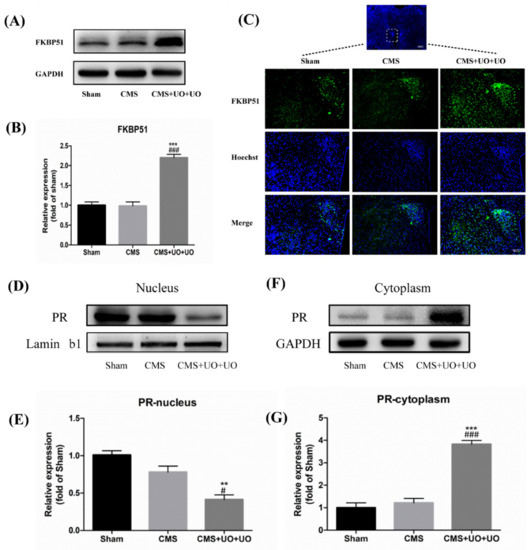 3.3. Hypothalamic FKBP51 Was Upregulated and Progesterone (PR) Nuclear Translocation Decreased in the Peri/Postmenopausal Depression Mice