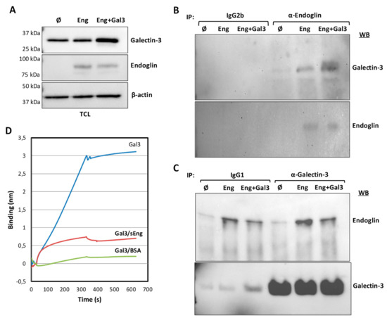 Protein–protein association between galectin-3 and endoglin. (A–C). Co-immunoprecipitation of galectin-3 and endoglin. CHO-K1 cells were transiently transfected with pcEXV-Ø (Ø), pcEXV–HA–EngFL (Eng) and pcDNA3.1–Gal-3 (Gal3) expression vectors. (A) Total cell lysates (TCL) were analyzed by SDS-PAGE under reducing conditions, followed by Western blot (WB) analysis using specific antibodies to endoglin, galectin-3 and β-actin (loading control). Cell lysates were subjected to immunoprecipitation (IP) with anti-endoglin (B) or anti-galectin-3 (C) antibodies, followed by SDS-PAGE under reducing conditions and WB analysis with anti-endoglin or anti-galectin-3 antibodies, as indicated. Negative controls with an IgG2b (B) and IgG1 (C) were included. (D) Protein-protein interactions between galectin-3 and endoglin using Bio-layer interferometry (BLItz). The Ni–NTA biosensors tips were loaded with 7.3 µM recombinant human galectin-3/6xHis at the C-terminus (LGALS3), and protein binding was measured against 0.1% BSA in PBS (negative control) or 4.1 µM soluble endoglin (sEng). Kinetic sensorgrams were obtained using a single channel ForteBioBLItzTM instrument.