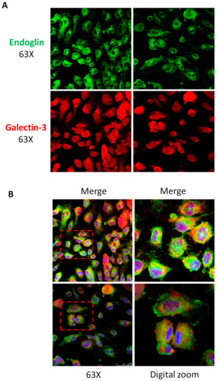 Immunostaining of galectin-3 was detected at the membrane and intracellular compartments, whereas endoglin signal was mainly located at the cell surface (Figure 2A). Some of these cells showed a clear membrane co-localization of galectin-3 and endoglin, as depicted in the merged images (Figure 2B, yellow staining). Because both endoglin and galectin-3 are expressed by endothelial cells [28,52], their additional co-localization within the same secretory pathway (for example in the Golgi) cannot be excluded. This would be compatible with the occasional perinuclear yellow staining observed (Figure 2B). Control labeling in the absence of primary antibodies did not show any positive signals (Supplementary Materials Figure S1), ruling out a potential artifact of immunofluorescent secondary antibodies. Taken together, the above results demonstrate the interaction and association between galectin-3 and endoglin.