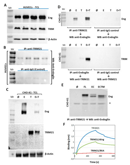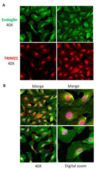 The TRIM family is a highly conserved group of E3 ubiquitin ligase proteins that have been implicated in the regulation of the TGF-β-dependent cellular, as well as in the ubiquitination and degradation of several components of TGF-β signaling pathway [55]. Unfortunately, little is known about the connection between the TRIM family and the TGF-β auxiliary receptor endoglin of endothelial cells. Among TRIM family members, TRIM21 acts not only as an E3 ubiquitin ligase on different target proteins, but also as a substrate in auto-ubiquitination, both leading to protein degradation [56,57,58]. In addition, TRIM21 is involved in cancer [59,60], inflammation [61,62,63,64], intracellular immunity, and autoimmunity [47,65,66,67]. Here, we validated the protein screen data for TRIM21, using two-way co-immunoprecipitation analysis of endoglin and TRIM21 in HUVECs and co-transfected CHO-K1 cells (Figure 3).