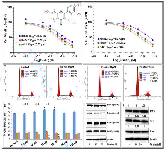 Fisetin at low doses (< 20 µM) does not significantly affect primary normal human epidermal keratinocyte (NHEK) growth and viability and does not induce apoptosis. (A/B) Relative number of viable NHEK, immortalized keratinocytes (HaCaT), and A431 cancer cells treated with or without fisetin (1–80 µM) for 24 h (A) and 48 h as determined by MTT assay. Mean of percentage viability of NHEK, HaCaT, and A431 cell lines plotted against the indicated doses of fisetin. Experiments were performed three times with each concentration done in octuplicate wells, and the IC50 values calculated from these plots are shown. (C) Effects of fisetin on the percentage of cells population in the different phases of cell cycle, and indication of late apoptosis or necrosis (i.e., PI-positive) cells were only seen in cells treated with higher fisetin concentration. (D) Levels or percentahes of cell cycle distribution in fisetin-treated cells as assessed by flow cytometry analysis. Bar graphs represent mean ± SD of results from three independent experiments performed in triplicate. Statistical significance was determined using one-way ANOVA and Dunn’s multiple comparison test and significance was considered when p < 0.05 (*), as compared with the control. (E) and (F) Effect of different concentrations of fisetin on the expression of markers of apoptosis including caspase-3, -8, and -9, PARP (85 kDa and 116 kDa) and Bcl-2 family of proteins (Bcl2, Bax, and Bak) on cells harvested after 48 h of treatment as analyzed by Western blotting. Equal protein loading was confirmed using β-actin as loading control. (F) Numerical data above the blots represent relative quantitative density values for the blots normalized with an internal loading control. The Western blot data shown are representative immunoblots of two to three independent experiments with similar results.