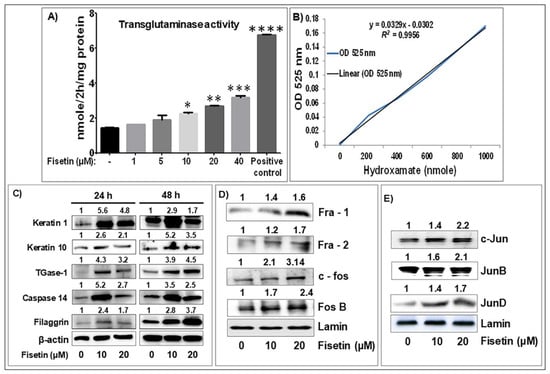 Fisetin treatment increased the expression of markers of epidermal keratinocytes’ differentiation and AP-1 transcription factor in NHEK. (A,B) The bar graphs represent dose-dependent induction of the differentiation marker transglutaminase (TGase) (a terminal differentiation marker) activity in NHEK treated with or without different doses of fisetin for 24 h, and the linear plot of the hydroxamate analysis of TGase activity. Data represent means ± SEM of three independent experiments, each performed in quadruplicate. Significance was assessed for control cells versus fisetin-treated cells or positive control, determined by one-way analysis of variance, as denoted by * p < 0.05, ** p < 0.01, *** p < 0.001, and **** p < 0.0001. Dose- and time-dependent increases in the protein expression of (C) early and late differentiation markers, and (D,E) nuclear protein expression of members of AP-1 factors subunits including Jun (C-Jun, Jun B, Jun D) and Fos (C-Fos, Fra-2, Fos-B) in NHEKs when compared to control cultures after 48 h, as analyzed by Western blotting. Panels (C–E) are representative of 2–3 experiments with similar results. Equal protein loading was confirmed using β-actin and lamin as loading controls, and the numerical data above the blots represent the quantitative relative densitometry values for the blots normalized to their respective loading controls.