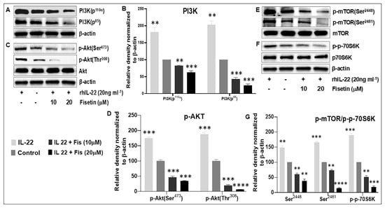Fisetin significantly suppresses the IL-22-induced activation of PI3K/Akt/mTOR signaling in NHEK. Western blot determined protein expression levels of (A,B) PI3-K (p110 and p85), and (C,D) phosphorylation of Akt (at Ser473 and Thr308), and (E) phosphorylation of mTOR (at Ser2448 and Ser2481), and (F) phosphorylation of p-p70S6K (Thr389), as compared with untreated cells (control) and IL-22-treated cells only. (B,D,G) graphs of the relative intensity of normalized protein components, where each bar depict means +/-SD of three different experiments. **, *** and **** indicate p < 0.01, p < 0.001, and p < 0.0001 vs. control for IL-22-treated only or vs. IL-22 for fisetin-treated cells.
