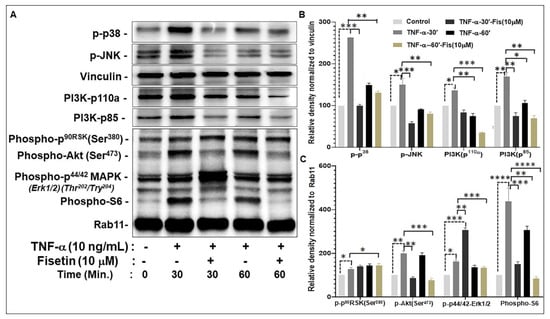 Given that fisetin inhibited IL-22-induced responses that are dependent on PI3K/AKT/mTOR and MAPK signaling, we next examined the effect of fisetin on TNF-α-induced PI3K/AKT/mTOR and MAPK pathway responses. NHEK cultures were pretreated with 10 µM fisetin for 24 h before stimulating with 10 ng/mL of rhTNF-α, and the ensuing effect on TNF-α-induced activation of PI3K/AKT/mTOR and MAPK- signaling was examined by Western blotting after 30 and 60 min (Figure 4). At 30 min, TNF-α treatment increased the levels of p-p38, p-JNK, PI3K (p110a and p85), p-p90RSK, p-Akt, p-ERK, and p-S6 (Figure 4). These TNF-α-induced effects were significantly inhibited upon pretreatment with 10 μM fisetin, except for the expression of p-p90RSK and p-ERK, the latter of which was enhanced by fisetin treatment (Figure 4).