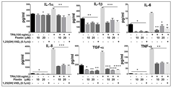 Next, we examined the role of fisetin on inflammatory responses induced by 12-O-tetradecanoylphorbol 13-acetate (TPA) on NHEK and induced by anti-CD3 plus anti-CD28 on PBMCs, and CD4+ T lymphocytes. Using Procarta-based Multiplex cytokine immunoassay, we first examined the effects of fisetin (10 and 20 μM) pretreatment on the TPA (100 ng/mL)-induced production of pro-inflammatory mediators IL-1α, IL-1β, IL-6, IL-8, TGF-α, and TNF-α by NHEK (Figure 5). It has been shown that treatment of NHEK with TPA can induce an inflammatory response mimicking the initial keratinocyte activation phase of the psoriatic process [10,61]. Here, we observed that fisetin pretreatment significantly decreased inactivated and TPA-induced NHEK secretion of the proinflammatory cytokines IL-1α, IL-1β, IL-6, IL-8, TNF-α, and the profibrotic mediator TGF-α. Of note, fisetin’s effects were highly similar to the effects elicited by 1, 25 hydroxyvitamin-D3 (Vit-D3) treatment upon TPA stimulation (Figure 5).