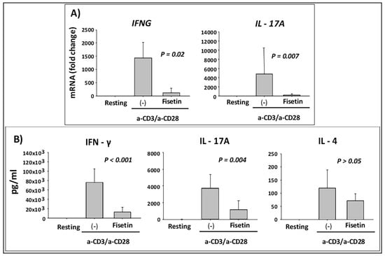 Because both keratinocyte and immune cell activation are involved in the initiation and chronicity of psoriasis and other inflammatory skin diseases [62,63,64], we next examined the effect of fisetin on anti-CD3/anti-CD28-activated PBMC secretion of inflammatory mediators. Subsequently, the mRNA expression level of type-1 and type-17 pro-inflammatory cytokines (IFNG and IL-17A) were analyzed when PBMCs were pretreated with fisetin (10 μM) for 10 min followed by activation with anti-CD3/CD28 for 6 h. As shown in Figure 6A, pretreatment of PBMC with fisetin resulted in significant inhibition of IFNG and IL17A mRNA accumulation. Under these conditions, PBMC were cultured for 48 h and analyzed for the cytokine protein production and release by ELISA. Altogether, these results demonstrated a significant inhibitory effect of fisetin on IFN-γ and IL-17 secretion, in spite of no obvious effect on the type-2 cytokine IL-4 (Figure 6B), and thus inhibition of inflammatory cells induced responses associated with the modulation of the expression of critical pro-inflammatory cytokines in psoriasis.