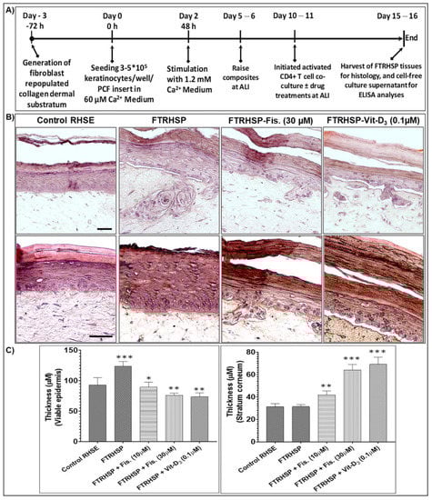 Since human psoriatic skin lesion is phenotypically characterized by increases in epidermal hyperplasia, antimicrobial peptides, inflammation, and aberrant differentiation and signaling cascades [36,37,65,66], we determined the effect of fisetin on the established FTRHSP model, which mimics in vivo features of psoriatic skin lesions compared with Vit-D3. After five days of administering T cells to the 3D human skin equivalents (day 15 from start), tissues were harvested as above and molecular markers of epidermal differentiation, inflammation, and proliferation were determined as indicated in the protocol in Figure 7A. We observed that control FTRHSP (RHSE) tissues generated by co-culture with nonactivated CD4+ T cells showed more condensed epithelium. In contrast, the regenerated 3D FTRHSP, incorporating activated CD4+ T cells, recapitulated several features of human psoriatic lesion, with lesser cornification including increases in epidermal thickness, proliferation, and other changes in the aforementioned features (Figure 2B,C; data not shown). Furthermore, as previously reported [36,37], fisetin-treated FTRSHP tissues co-cultured with activated CD4+ T cells had a much thinner viable epidermis, similar to control tissues. These observations were comparable to the effects elicited by a single dose of Vit-D3 (0.1 µM) (Figure 7B,C).