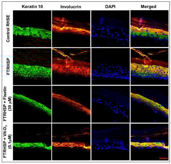 Fisetin modulates psoriasis-like features in the 3D full-thickness reconstituted human skin model of psoriasis (FTRHSP). Immunofluorescence staining was performed on FTRHSP sections by incubating with primary antibody against targets overnight at 4 °C followed by incubation with specific Alexa Flour 488-labeled secondary antibodies for 2 h at room temperature in the dark. Samples were mounted in mounting medium containing 4′,6-diamidino-2-phenylindole (DAPI) and analyzed microscopically. Immunofluorescence staining analysis of differential staining showing the protein expressions of early (K10) and late (involucrin) differentiation markers in control RHSE and FTRHSP under different treatment conditions. Stainings are shown in red and green, respectively, and DAPI in blue and results are representative images of two independent experiments each performed in quadruplicate in comparison to the control and treated FTRHSP. Scale bar = 20 μm.