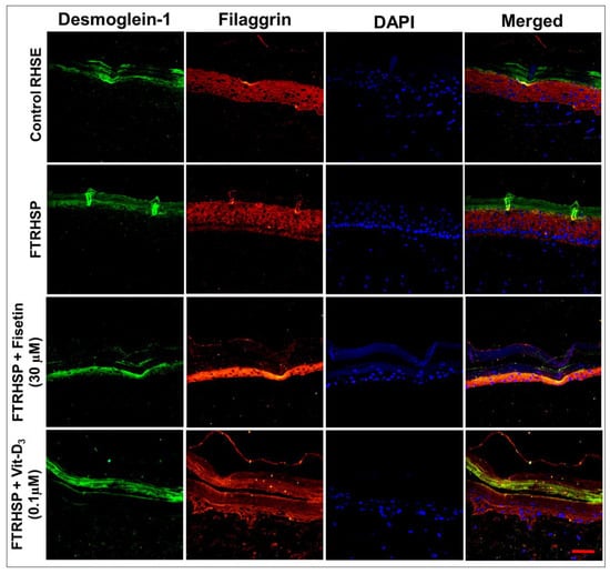 Representative immunofluorescent photomicrographs showing the protein expression levels of differentiation (filaggrin) and desmosomal (desmoglein-1) protein markers in control RHSE and FTRHSP under different treatment conditions versus fisetin or Vit-D3-treated FTRHSP tissues. Results are representative of three independent experiments each performed in quadruplicate and comparing control RHSE vs. FTRHSP treated groups. Data green (Dsgl-1); red (filaggrin), blue (DAPI) and mixed is merged representation. Dsgl-1 = desmoglein-1. Scale bar = 20 μm.