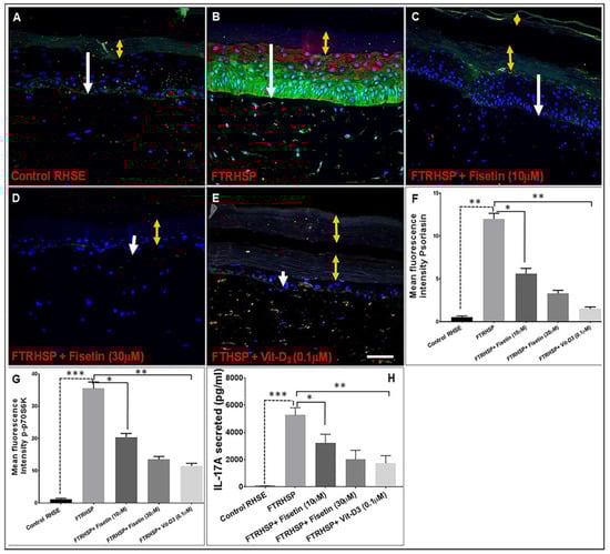 Fisetin modulated the expression of makers of psoriasis-like inflammation and mTOR activity in 3D human skin model of psoriasis. Immunofluorescence staining for p-p70S6K and Psoriasin was performed on FTRHSP sections by incubating with primary antibody against targets overnight at 4 °C followed by incubation with specific Alexa Flour 488-labeled secondary antibodies for 2 h at room temperature in the dark. Samples were mounted in mounting medium containing 4′,6-diamidino-2-phenylindole (DAPI) and analyzed microscopically. (A–E) the antimicrobial peptide (psoriasin) and mTOR activation effector, p-p70S6K stainings are shown in red and green, respectively, and DAPI in blue. Representative pictures are shown. Scale bar = 20 μm. The yellow arrows delineate the thickness of the stratum corneum, while the white arrows indicate the thickness of the viable epidermis. (F,G) For densitometric quantification, each color image was separated into its green, blue, and red channel components using ImageJ software (National Institutes of Health, Bethesda, MD, USA), and green and red channels were used to analyze mean fluorescent intensity. Data shown here are mean fluorescence intensity ± SEM. (H) Differential protein expression levels of IL-17A secreted in the conditioned media of FTRHSP cultures. Pro-inflammatory cytokines IL-17A in conditioned media, were analyzed when 3D FTRHSP were treated without and with fisetin (10–30 µM) treatment or 0.1 µM Vit-D3 for five days following activation by co-culturing with anti-CD3/CD28 activated CD4+ T cells for seven days as described in Section 2.12. Significant differences were determined and significance of comparisons were made for the expression levels of the target proteins of FTRHSP tissues versus fisetin or Vitamin D3-treated FTRHSP, corresponding to the solid lines, and also between nonactivated T cell-exposed control RHSE versus FTRHSP tissues, indicated by the broken lines, as denoted by * p < 0.05, ** p < 0.01, and *** p < 0.001.