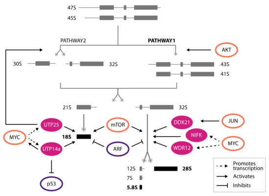 Whereas the pleiotropic effects of oncogenes and tumor suppressors on rRNA transcription have been well documented, less is known about the impact of cancer-related genes on the regulation of rRNA maturation and processing (summarized in Figure 2).