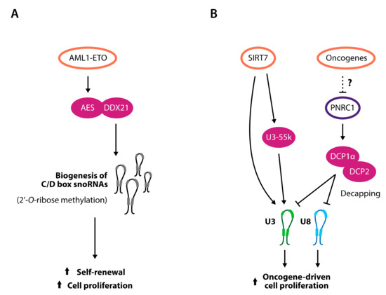 As for the transcription and processing of rRNA, the biogenesis of the snoRNP machinery is also directly stimulated by the action of oncogenes. Evidences from both Drosophila and human cancer cell lines show that a large number of snoRNAs are downregulated upon the depletion of the MYC oncogene and that several snoRNA host genes or genes encoding for snoRNPs feature MYC binding sites in their promoter sequences [104]. These data not only imply that the pleiotropic MYC stimulation of ribosome biogenesis pathway also includes a direct transcriptional control on snoRNA and snoRNA-related genes but might also suggest that snoRNAs can mediate and potentiate the downstream effects of oncogene activation leading to cancer establishment and progression. This is the case of acute myeloid leukemia (AML), where the interference with oncogene-induced snoRNA biogenesis was shown to attenuate the oncogenic potential of leukemic cells [105]. In this context, the AML1-ETO fusion oncoprotein stimulates the maturation of C/D box snoRNPs through the interaction between its downstream effector AES and DDX21. As a consequence, the depletion of snoRNAs in AML cells dramatically decreases rRNA 2′-O-ribose methylation, therefore reducing protein translation rates and ultimately impairing the oncogene-induced proliferation and self-renewal capacities of leukemic cells (Figure 3A).