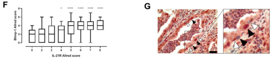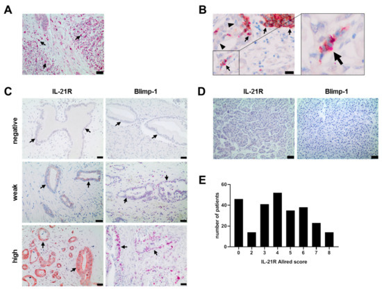 In the same tissue specimen, expression of IL-21R and its downstream target Blimp-1 was determined. IL-21R was found to be expressed on tumor cells of 221/264 patients and Blimp-1 in 199/264, but not in healthy pancreatic tissue (Figure 1C,D). Expression of IL-21R varied among the patients, as quantified by Allred score (distribution shown in Figure 1E) and high Blimp-1 expression coincided significantly with high IL-21R expression (Figure 1F, unpaired t test and Pearson correlation test (r = 0.5604, p < 0.0001)). Double staining of the tissue revealed a co-expression of IL-21R and Blimp-1 (Figure 1G).