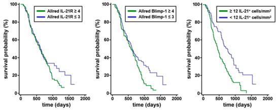 There was a trend towards shorter overall survival (OS) time in patients with high IL-21R Allred scores (score 4 to 8, median 592 days) compared to patients with low IL-21R Allred scores (scores 0 to 3, median 616 days), although the difference was not statistically significant according to the log-rank test (p = 0.1516). The OS time of patients with high Blimp-1 expression (Allred scores score 4 to 8) was considerably shorter compared to patients with low Blimp-1 Allred scores (scores 0 to 3) as assessed by Kaplan–Meier-Analysis (576 days versus 616 days; log-rank test p = 0.0126) (data summarized in Figure 2).