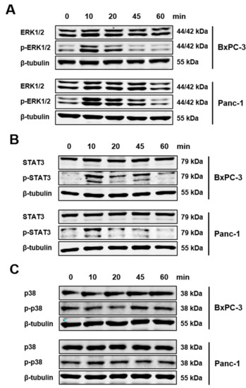 - Alam, M.S.; Gaida, M.M.; Bergmann, F.; Lasitschka, F.; Giese, T.; Giese, N.A.; Hackert, T.; Hinz, U.; Hussain, S.P.; Kozlov, S.V.; et al. Selective inhibition of the p38 alternative activation pathway in infiltrating T cells inhibits pancreatic cancer progression. Nat. Med. 2015, 21, 1337–1343. [Google Scholar] [CrossRef]
