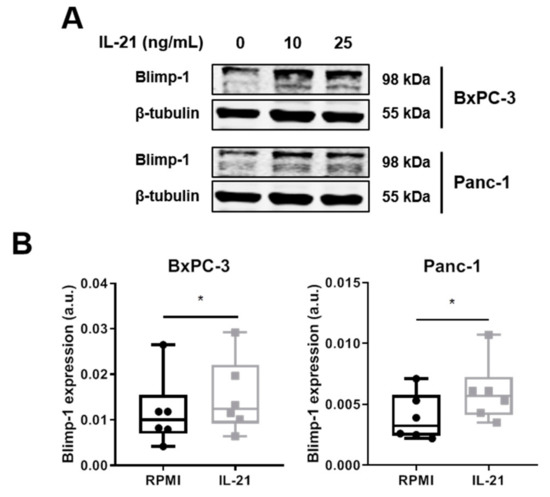 Moreover, after a 24 h IL-21 stimulation, a significant induction of Blimp-1 protein expression was seen for BxPC-3 and Panc-1 (35% increase for BxPC-3 and 62% increase for Panc-1, average calculated from n = 6 independent experiments) (Figure 5A,B). Prolonged culture of IL-21 did not result in a further increase; in line with the finding that mRNA for PRDM1 was already induced within 2 h (BxPC-3: 46.8%, Panc-1: 47.2%; n = 3) (Supplementary Figure S2A,B). Upregulation of Blimp-1 was reduced when cells were cultivated in the presence of an ERK inhibitor (Figure 5C).