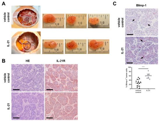 As shown in Figure 6A,B, tumor cells were engrafted on the CAM and expressed the IL-21 receptor. Furthermore, in the IL-21-treated group, expression of Blimp-1 was significantly increased (>two-fold upregulation (27.33 vs 59.92%)) (Figure 6C).