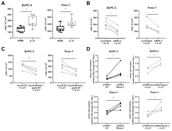 IL-21 promotes cell invasion in human PDAC cell lines in a Blimp-1-dependent manner. (A) Invasion of either untreated (RPMI) or IL-21-treated (10 ng/mL) BxPC-3 and Panc-1 cells was determined after 48 h. (B) Invasion of BxPC-3 and Panc-1 cells transfected with either a scrambled siRNA or a PRDM1-targeting siRNA (siRNA C) for Blimp-1 protein knockdown after 48 h of IL-21 (10 ng/mL) treatment. (C) Invasion of BxPC-3 and Panc-1 transfected with pLenti EV or pLenti Blimp-1 construct for CRISPR/Cas9-mediated Blimp-1 knockout after 48 h of IL-21 (10 ng/mL) treatment. (D) Invasion of BxPC-3 and Panc-1 transfected with a dox-inducible pTRIPZ EV or pTRIPZ Blimp-1 construct for Blimp-1 overexpression. Relative fold change of invaded cells treated with (dox+) and without dox (dox−) (1 µg/mL). Left panel: invasion of untreated (RPMI) cells, right panel: invasion of IL-21-treated (10 ng/mL) cells * P < 0.05 and ** P < 0.01. Unpaired t-test.