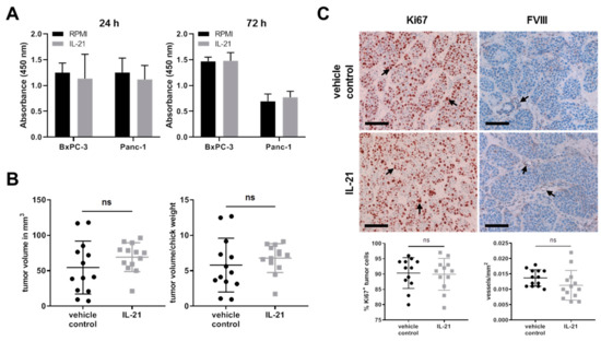 Effects on proliferation upon stimulation of cells via IL-21R were analyzed using a BrdU assay. IL-21 (10 ng/mL) did not significantly promote proliferative activity within 72 h in vitro (Figure 8A). In the avian xenograft, the resected tumors differed with regard to size within the groups; there was, however, only a minor but not significant difference between the IL-21-treated and vehicle control group (Figure 8B). In line with these findings, there was no difference in proliferation (Ki67) or neovascularization (FVIII) in the avian xenograft, as analyzed by immunohistochemistry (Figure 8C).
