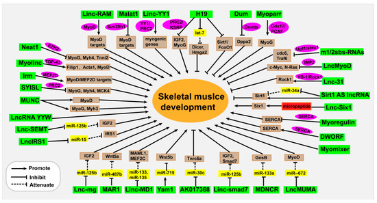 Although 80% of the eukaryotic genome is transcribed, only 2% of transcripts are translated into proteins [26]. Noncoding transcripts account for the vast majority of eukaryotic transcripts. The noncoding RNAs mainly include microRNAs (miRNAs), Piwi-interacting RNAs (piRNAs), circular RNAs (circRNAs), and long noncoding RNAs (lncRNAs). In this article, we focus primarily on lncRNAs, which are more than 200 nucleotides in length and have no protein-coding capacity [27]. Most lncRNAs are transcribed by RNA polymerase II, 5′ end capped, 3′ end poly(A) tailed, and post-transcription spliced [28,29,30]. Although lncRNAs are less abundant, less evolutionarily conserved, and have fewer exons compared to mRNA, their expression patterns are more spatio-temporally specific [31,32,33]. In the last decade, an increasing number of studies have indicated that lncRNAs participate in diverse cell and tissue development processes, such as X chromosome inactivation, genomic imprinting, stem cell maintenance, embryonic development, myogenesis, immunity, and tumorigenesis [34,35,36,37,38,39]. lncRNAs exert their functions through diverse mechanisms, including by regulating chromosome structures, gene transcription, mRNA stability and translation, and post-translational modification [32]. Here, we review recent advances regarding the importance of lncRNAs in skeletal muscle development, regeneration, and disease.