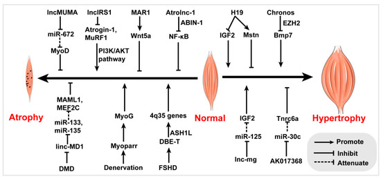 Muscle hypertrophy is associated with increased intracellular RNA and protein synthesis, and decreased protein degradation. The balance between protein synthesis and degradation is regulated by many pathways and regulators, such as the mTOR, IGF, and AMPK pathways, myostatin, and myogenic regulatory factors [115,116,117,118]. In addition, muscle hypertrophy requires activation of satellite cells [119,120]. Recent studies have indicated that several lncRNAs, such as H19, Chronos, lnc-mg and AK017368, are associated with muscle hypertrophy [56,60,77,79,87].