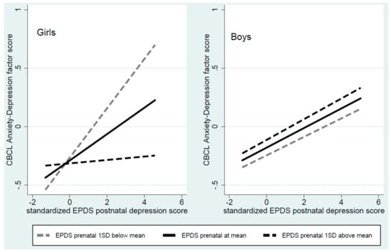 - Quarini, C.; Pearson, R.M.; Stein, A.; Ramchandani, P.G.; Lewis, G.; Evans, J. Are female children more vulnerable to the long-term effects of maternal depression during pregnancy? J. Affect. Disord. 2016, 189, 329–335. [Google Scholar] [CrossRef]
