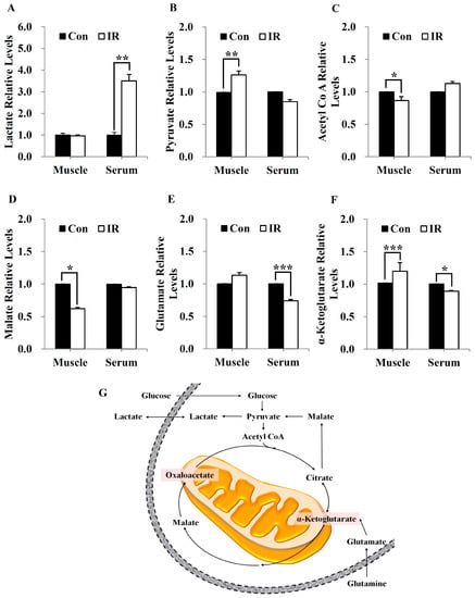 Mouse blood samples were obtained and serum was immediately separated by centrifugation at 3000 rpm for 15 min at 4 °C. Muscle tissue samples (snap-frozen in liquid nitrogen) and C2C12 myotubes were disrupted using a TissueLyser II (Qiagen; Hilden, Germany) and homogenized in the extraction solution provided in the assay kit. Samples were deproteinized using 10-kDa molecular weight cut-off spin columns (Biovision; Milpitas, CA, USA). Assay kits were used to measure concentrations of lactate, pyruvate, acetyl-CoA, malate, glutamine, α-ketoglutarate (Biovision), and NAD+/NADH (Bioassay System; Hayward, CA, USA) according to the manufacturer’s instructions.