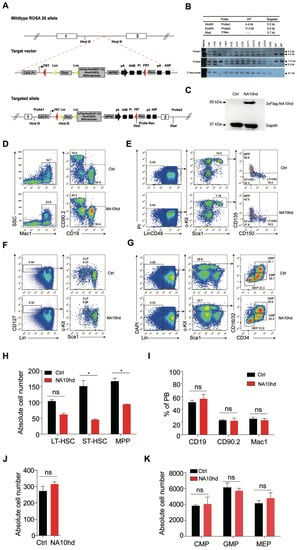 To assess the effect of NA10hd on hematopoiesis, we performed flow cytometric analysis on multi-blood lineages in peripheral blood (Figure 1D), hematopoietic stem cells, multi-potential progenitors cells (Figure 1E), and myeloid and lymphoid progenitors (Figure 1F,G), in bone marrow of NA10hd and littermate control mice. The absolute cell number of hematopoietic stem cells and multilineage progenitor cells of NA10hd was mildly less than those of control mice (Figure 1H). However, the absolute number of the mature myeloid or lymphoid cells in the peripheral blood (Figure 1I), lymphoid progenitor cells (Figure 1J), and myeloid progenitors (Figure 1K) in the bone marrow was comparable between NA10hd and the control. Analysis results from 12-month-old aged NA10hd mice were largely similar, despite the number of long-term HSC and lymphoid progenitors being significantly less than the littermate control (Figure S1). Taken together, NA10hd-expresssing mice generally show normal hematopoieisis despite having a decreased number of hematopoietic stem and progenitor cells.