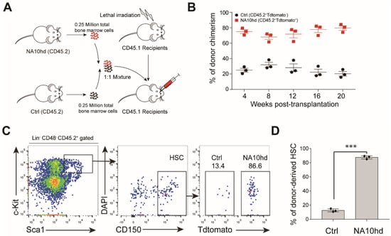 Hematopoietic stem cells expressing NA10hd protein demonstrates a competitive engraft advantage. (A) Diagram of the competitive transplantation assay of NA10hd and the littermate control (NA10hdLSL/+, CD45.2) bone marrow hematopoietic stem cells. NA10hd and control bone marrow nucleated cells were transplanted into lethally irradiated (2 × 5.0 Gy) recipients (CD45.1) at a ratio of 1:1, and the percentage of donor cells and donor-derived specific lineage within donor-derived cells in peripheral blood were analyzed regularly after transplantation. (B) Donor chimerism in peripheral blood. (C) Flow cytometric analysis of donor-derived (NA10hd or control) hematopoietic stem cell (HSC) proportion in bone marrow of recipients 20 weeks post transplantation. Data are representative of two independent experiments. (D) Statistical analysis of NA10hd or control donor-derived HSC in recipient bone marrow 20 weeks post-transplantation. Data are represented as means ± SD. Unpaired Student’s t-test (two-tailed) was performed. Three mice, *** p < 0.001.