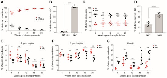Comparison of engraftment competitiveness of NA10hd and NrasG12DLSL/+; Vav1-Cre (NV) hematopoietic stem cells. (A) Donor-derived cell chimerism in peripheral blood. NV and NA10hd bone marrow nucleated cells were transplanted into lethally irradiated (2 × 5.0 Gy) recipients (CD45.1) at a ratio of 1:1, and the percentage of donor cells in peripheral blood was analyzed regularly after transplantation. (B) The proportion of NA10hd or NV HSC in recipient bone marrow was measured by flow cytometric analysis 20 weeks post-transplantation. (C) Donor-derived cell chimerism in peripheral blood. NAV and NV bone marrow were transplanted into lethally irradiated (2 × 5.0 Gy) recipients (CD45.1) at a ratio of 1:1, and the donor cells in peripheral blood was analyzed regularly after transplantation. (D) The proportion of NV or NAV HSC were measured by flow cytometric analysis 20 weeks post-transplantation. (E–G) Donor-derived percentages of T lymphocytes (E), B lymphocytes (F), and myeloid cells (G) in peripheral blood were analyzed regualrly after transplantation. Data are represented as means ± SD. Unpaired Student’s t-test (two-tailed) was performed. N = 5 mice. * p < 0.05, ** p < 0.01, *** p < 0.001, ns indicates no significant. NrasG12D and NUP98-HOXA10HD enhance the competitiveness of HSC via distinct signaling mechanisms.