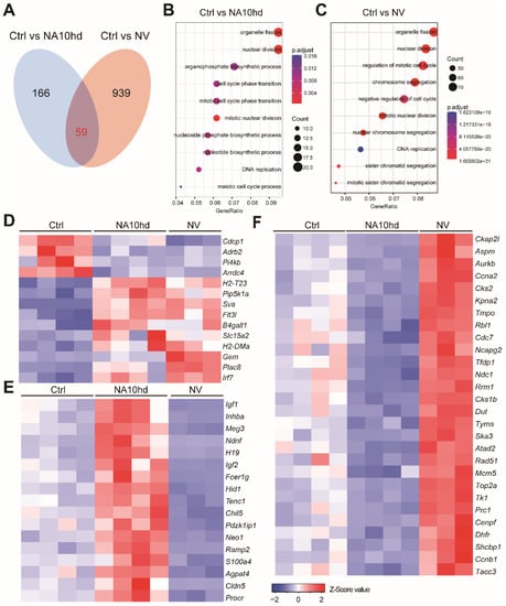 To investigate the molecular mechanism by which NV and NA10hd enhanced the competitiveness of HSC, we sorted Lin (CD2, CD3, CD4, CD8, B220, Gr1, Mac1, Ter119)−CD48−c-Kit+Sca1+CD135−CD150+ (Figure S2) HSC from NV, NA10hd, and wild-type mice for transcriptome analysis. Since one thousand cell input for RNA-Seq produced reads uniformly covers all transcripts [16], we sorted one-thousand HSC aliquots for RNA-Seq analysis. Differential gene expression analysis identified 225 differential expression genes (DEGs) in NA10hd HSC (Table S1) and 998 DEGs in NV HSC (Table S2) when compared to wild-type HSC (DEGs were defined as a difference in the expression level over 1.5-fold, adjusted the p value < 0.05 (DESeq2 R package)). There were only 59 overlapping DEGs in NA10hd and NV (Figure 4A). GO enrichment analysis using the NA10hd or NV DEGs showed that these DEGs were largely related to pathways of the cell cycle, cell division, and DNA replication and nuclear division (Figure 4B,C). Only 14 of the 59 (<20%) overlapping DEGs from NA10hd and NV HSC showed a similar expression trend (Figure 4D). However, more than 80% of the overlapping DEGs had opposite expression trends in NA10hd and NV. There were approximately 17 (28%) DEGs that were up-regulated in NA10hd HSC, but down-regulated in NV HSC including H19 and Igf2 that regulate HSC quiescence [17] (Figure 4E). In addition, 28 (>50%) DEGs were up-regulated in NV HSC, but down-regulated in NA10hd HSC (Figure 4F).