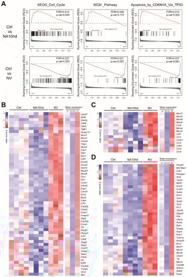 Gene set enrichment analysis (GSEA) showed opposite-signaling patterns in HSC altered by NA10hd and NV expression. (A) The gene sets of the KEGG_Cell_Cycle, MCM_Pathway, and Apoptosis_by_CDKN1A_Via_TP53 signaling pathways from the public GSEA database (http://software.broadinstitute.org/gsea/downloads.jsp) were used for GSEA analysis using the GSEA R package. Nominal p value, empirical phenotype-based permutation test (p < 0.05, FDR < 0.25). (B) Heatmaps represent the expression of leading-edge genes in a KEGG_Cell_Cycle pathway. (C) Heatmaps represent the expression of leading-edge genes in an MCM pathway. (D) Heatmaps represent the expression of leading-edge genes in Apoptosis_by_CDKN1A_Via_TP53 signaling pathways. Columns represent the indicated biological replicates of each population (B–D).