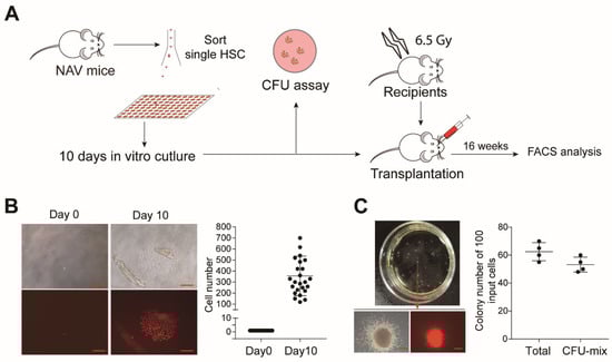 HSC are susceptible to stress and prone to die in vitro in the absence of feeder cells, which can only be expanded with cell lines such as AFT024 and UG26 [29,30]. It is also reported that adult mouse HSC (E-SLAM cells) transduced with a retrovirus expressing NA10hd could expand efficiently during the 14-day culture with an addition of IL-3, IL-6, and SCF [4]. We wondered whether single NAV-HSC could overcome the culture stress and expand in a feeder-free condition. We sorted single Lin (CD2, CD3, CD4, CD8, B220, Gr1, Mac1, Ter119)−CD48−c-Kit+Sca1+CD135−CD150+ NAV-HSC or WT-HSC into individual wells of a 96-well low adhesion plate containing 150 µL culture medium (StemSpan™ SFEM plus with 100 ng/mL mSCF, 20 ng/mL human IL11, and β-mercaptoethanol (2000-fold diluted)). To evaluate the stemness preservation, colony-forming unit (CFU) and transplantation assay were performed using the single cell-derivatives after a 10-day culture (Figure 6A). Amazingly, more than 30% (25/80) of wells with single NAV-HSC input proliferated to produce colonies composed of more than 100 cells (Figure 6B). In contrast, we observed very rare daughter cells from the WT HSC group (data not shown). Notably, certain wells showed homogenous morphology with uniform offspring cells in size. We divided the recovered cells from each well into two equal aliquots, one for an in vitro colony-forming assay (CFU-C) and the other for in vivo transplantation. As expected, only the cells with homogeneous morphology daughter cells (Figure S4A) produced CFU-Mix colonies (Figure 6C), but not the wells with heterogeneous size derivatives (Figure S4B).