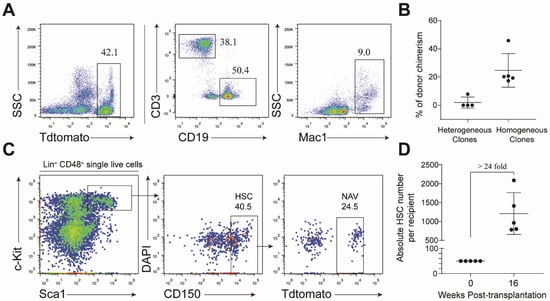 All the competitive transplantation of total bone marrow were performed at the ratio of 1:1 (0.25 million to 0.25 million). The recipients (CD45.1) of all competitive transplantation were lethal irradiated (2 × 5.0 Gy). The donor-derived chimeric ratios of peripheral blood cells were analyzed regularly and the HSC compartment was analyzed 20 weeks post-transplantation. Donor-derived cells from NA10hd and NAV were identified with Tdtomato.