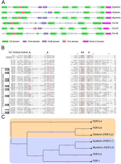 Structure and phylogenic relation of ferlin proteins. (A) Schematic structure of FER-1 human homologs as produced by Pfam protein families’ database. (B) Clustal omega multiple alignment of ferlin C2 domains. Conserved Ca2+-binding site are highlighted in red (aspartic acid—D) or yellow (glutamic acid—E). (C) Cladogram of clustal omega alignment indicating type 1 ferlins in blue and type 2 ferlins in yellow. The branch length is indicated in grey.