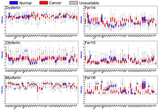 Considering that ferlins have been only scarcely investigated in cancer, the authors next sought to mine publicly available databases and gain information regarding ferlin’s expression or mutation in tumors. Using the FireBrowse gene expression viewer (firebrowse.org), The Cancer Genome Atlas (TCGA) RNAseq data of all ferlin’s genes in neoplastic tissues were investigated in order to obtain a differential expression in comparison to their normal counterparts. It appears that all ferlin genes are modulated in several cancer types. Myoferlin and fer1l4 genes are more frequently up regulated than down regulated, while dysferlin, fer1l5, and fer1l6 are more frequently down regulated (Figure 2).
