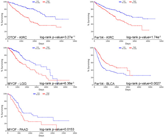 This review then explored the mutations occurring in ferlin genes in tumours using Tumorportal (http://www.tumorportal.org) [89]. Several mutations were reported in ferlin genes in a few cancer types. However, none of them were considered as significant. Survival was also analysed (Table 3) using a pan-cancer method available online (OncoLnc–http://www.oncolnc.org) and combining mRNAs, miRNAs, and lncRNAs expression [90]. Noticeably, otoferlin expression was strongly significantly correlated with survival in renal clear cell carcinoma (KIRC–p < 10−5); myoferlin expression was strongly significantly correlated with survival in brain lower grade glioma (LGG–p < 10−4) and pancreatic adenocarcinoma (PAAD–p < 10−4), and Fer1l4 expression was strongly significantly correlated with survival in bladder urothelial carcinoma (BLCA–p < 10−5) and kidney renal clear cell carcinoma (KIRC–p < 10−5). The 5 more significant correlations between ferlin’s expression and the overall survival were represented as Kaplan-Meier curves with their associated log-rank p-value (Figure 3).