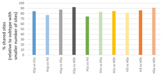 Passage bias sites were also frequently shared between different influenza subtypes (e.g. pandemic H1, seasonal H1, H3, H5). Interestingly, the extent of sharing (Figure 1) appears to mirror the genetic distance of the subtypes relative to each other known from phylogenetic trees. For example, pandemic H1 shares more sites with H5 than H3. Furthermore, this allows consideration of passage sites shared among multiple subtypes as universal consensus to avoid subtype-specific biases such as culture type preference or temporal variations.
