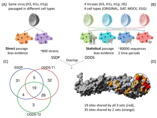 Occasionally, virus strains can be found in the database where the same strain has been passaged in different cell types (Same Strain Different Passage = SSDP). Especially relevant for us is if the different passage was between mammalian (MDCK/SIAT) and avian (EGG) cell types. These examples are of great value for this study as they represent a clean signal of different passage conditions for the very same starting strain or genomic backbone. Considering only H3, H1s and H1p since H5 data were limited, there are 59 sites shared between at least two subtypes (Figure S3). These conserved direct passage sites are then compared against the two time period sets from the indirect passage sites from large-scale statistical analysis and define our proposed set of robust common passage bias sites. 19 passage bias sites are shared between all three data sets and 54 are shared between at least two (Table 2 and Figure 2).