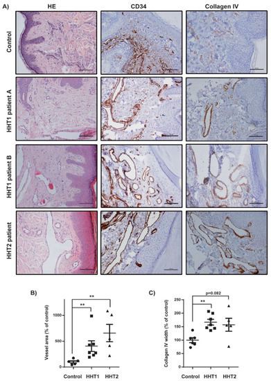 In our study, we have found an enlargement in vessels and a higher collagen IV expression in both HHT1 and HHT2 human telangiectasia biopsies than in controls. BMs are composed of macromolecules such as collagen IV [23]. In recent years, the understanding of the BM has changed from a mere structural component of tissues, to be considered an active modulator of blood vessel formation. Type IV collagen promotes cell adhesion, migration, differentiation, and growth, playing a critical role in EC proliferation and angiogenesis [23,24,25,26]. Moreover, in cutaneous collagenous vasculopathy, a benign rare acquired idiopathic microangiopathy characterized by diffuse telangiectasia, immunohistochemical staining revealed extensive deposition of type IV collagen around the blood vessels [27,28]. The exact role of type IV collagen in telangiectasia development in HHT, needs further investigation.