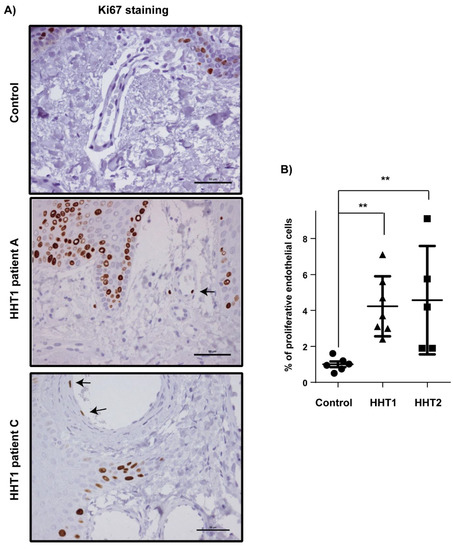 Increased endothelial cell proliferation in HHT1 cutaneous telangiectasia biopsies. (A) Ki-67 (brown nuclei, arrows) staining of endothelial cells in one control and two HHT1 patients. Scale bars, 100 µm. (B) Quantification of the percentage of Ki-67-positive endothelial cells in controls (n = 6), HHT1 patients (n = 7), and HHT2 patients (n = 5). Error bars indicate the standard errors of the mean. Statistical significance of two-tailed Mann–Whitney U tests: ** p < 0.01.