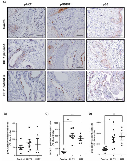 To analyze PI3K pathway activation, we performed immunohistochemistry for phosphorylated proteins pNDRG1, pAKT, and pS6. The mean percentage of ECs positive for these markers resulted in higher values in HHT1 patients than in controls, being statistically significant for pNDRG1 (p = 0.001) and pS6 (p = 0.022). In accordance with previous results, HHT2 patients also showed statistically significant higher percentage of positive ECs than controls for pNDRG1 (p = 0.004) and pS6 (p = 0.004) (Figure 4).