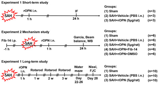 Experimental design. SAH, subarachnoid hemorrhage; WB, western blot; PBS, phosphate-buffered saline; IF, immunofluorescence; rOPN, recombinant osteopontin; i.n., intra nasal administration; Fib-14, focal adhesion kinase (FAK) inhibitor 14; i.p., intraperitoneal administration; DMSO, dimethyl sulfoxide; FJC, Fluoro-Jade C.