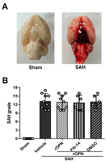 Analysis of subarachnoid hemorrhage (SAH) grades in all SAH groups. (A) Representative brain images of Sham and SAH rats. (B) Summary of SAH grading scores of all groups. SAH, subarachnoid hemorrhage; rOPN, recombinant OPN; Fib-14, FAK inhibitor 14; DMSO, dimethyl sulfoxide.