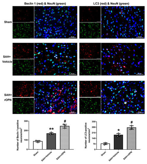 Nasal administration of rOPN increases the expression of Beclin 1 (red fluorescence) and LC3 (red fluorescence) in neurons (green fluorescence). Cell nuclei were counterstained with DAPI (blue fluorescence). n = 3 per group. Scale bar = 50 µm. Data are presented as mean ± SD. * p < 0.05, ** p < 0.01 vs. Sham group; # p < 0.05, vs. SAH + Vehicle group.