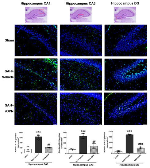 Fluoro-Jade C staining and consecutive cell count and statistical analysis also revealed a significantly increased number of FJC-positive cells in the SAH + Vehicle group compared with the Sham group in the CA1, CA3, and dentate gyrus sectors (p < 0.001, Figure 8). However, the number of FJC-positives cells in all three sectors was significantly decreased in the SAH + rOPN group compared with the SAH + Vehicle group (p < 0.01, Figure 8), indicating attenuation of neuronal injury or degeneration by nasal administration of rOPN.