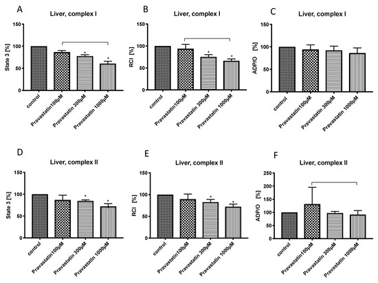 The lowest concentration of pravastatin (100 µM) did not affect the mitochondrial respiration in the liver. Pravastatin in higher concentrations (300 µM and 1000 µM) reduced state 3 (complex I: pravastatin 300 µM: 77.5% ± 3.2%*, pravastatin 1000 µM: 60.7% ± 5.3%*; complex II: pravastatin 300 µM: 84.8% ± 2.4%*, pravastatin 1000 µM: 72.3% ± 6.2%*) (Figure 1A,D) and RCI (complex I: pravastatin 300 µM: 75.3% ± 5.0%*, pravastatin 1000 µM: 66.4% ± 4.2%*, complex II: pravastatin 300 µM: 82.6% ± 6.1%*, pravastatin 1000 µM: 72.2% ± 5.9%*) (Figure 1B,E) for both complexes without changing the ADP/O-ratio (Figure 1C,F).