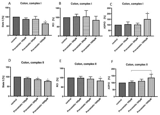 The lowest concentration of pravastatin (100 µM) did not affect the mitochondrial respiration in the colon. Pravastatin in middle concentration (300 µM) reduced state 3 for complex II (86.1% ± 4.8%*) (Figure 2D) and in high concentration (1000 µm) decreased state 3 for both complexes (complex I: 63.6% ± 8.2%*, complex II: 77.3% ± 4.1%*) (Figure 2A,D).