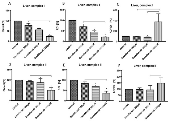Similarly to pravastatin, gemfibrozil in low concentration (100 µM) did not affect the mitochondrial respiration in the liver. Gemfibrozil at higher concentrations (300 µM and 1000 µM) reduced state 3 (complex I: gemfibrozil 300 µM: 56.9% ± 5.5%*, gemfibrozil 1000 µM: 24.4% ± 2.5%*; complex II: gemfibrozil 300 µM: 87.8% ± 18.5%*, gemfibrozil 1000 µM: 50.9% ± 11.4%*) (Figure 3A,D) and RCI (complex I: gemfibrozil 300 µM: 45.1% ± 5.2%*, gemfibrozil 1000 µM: 21.5% ± 2.8%*, complex II: gemfibrozil 300 µM: 70.4% ± 5.5%*, gemfibrozil 1000 µM: 37.8% ± 8.3%*) (Figure 3B,E) for both complexes. Gemfibrozil 300 µM reduced ADP/O for complex I (81.5% ± 7.6%*) (Figure 3C). ADP/O-ratio after treatment with gemfibrozil 1000 µM was significantly higher than ADP/O-ratio in other gemfibrozil-groups.
